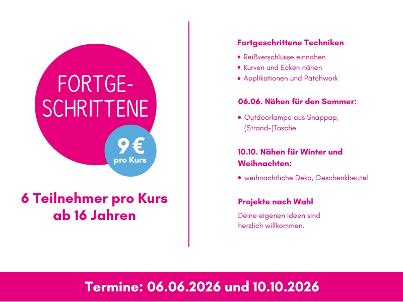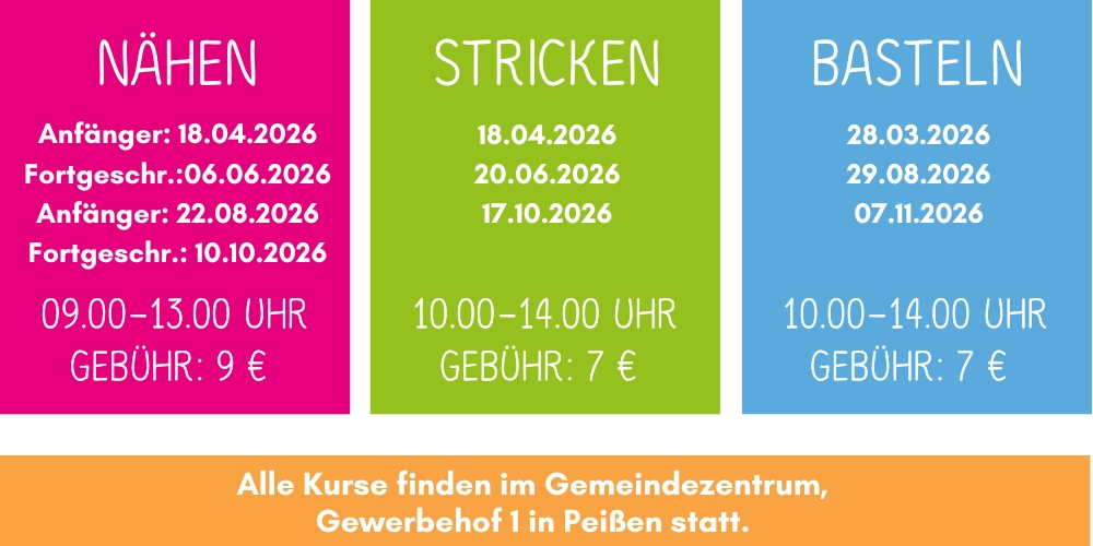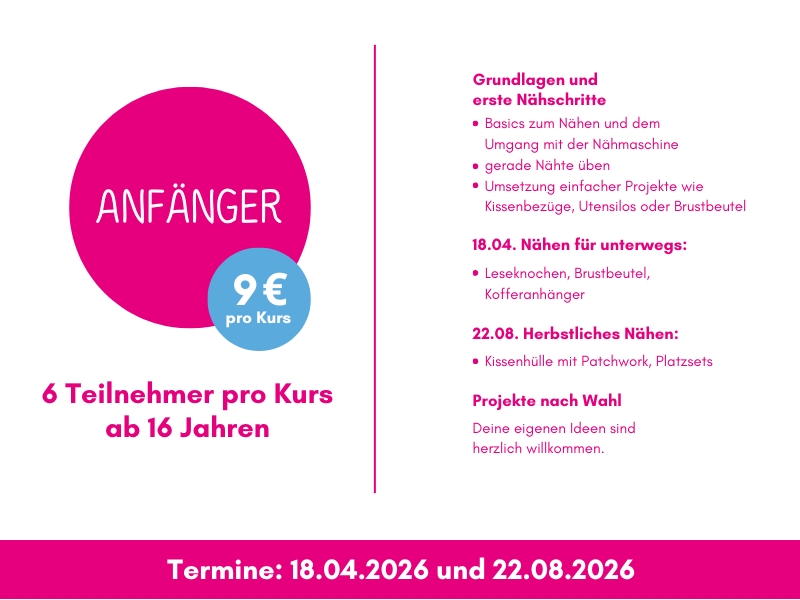 Unsere Kurse richten sich an alle, die Freude an Handarbeit und kreativem Gestalten haben oder neue Techniken ausprobieren möchten. Neben dem Nähen bieten wir auch Bastelkurse sowie einen Kurs zum Stricken lernen an.