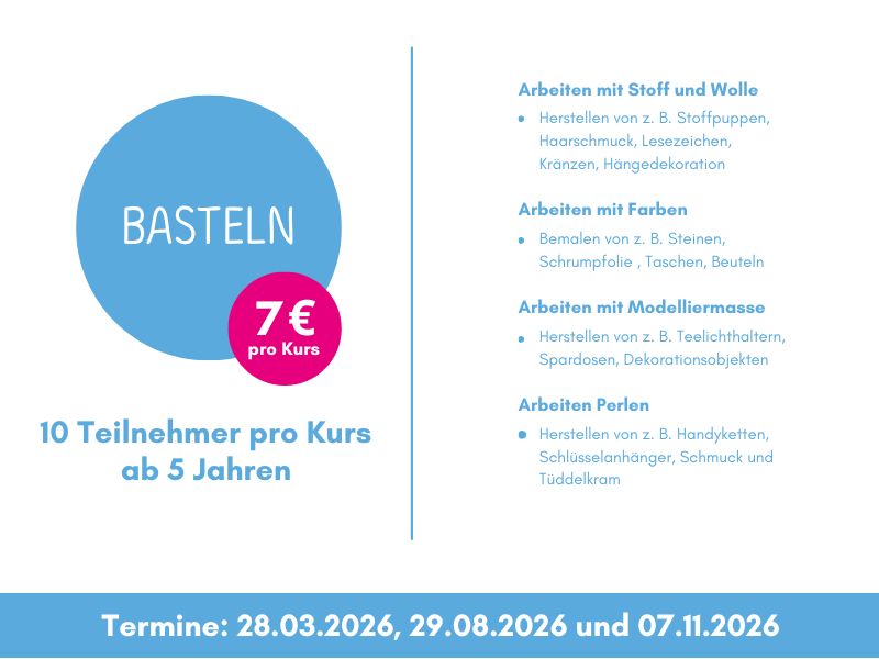 In entspannter Atmosphäre und unter Anleitung können im Bastelkurs groß und klein gemeinsam ihre Kreativität mit unterschiedlichen Materialien ausleben. Je nach Alter und Kenntnisstand werden unterschiedliche Projekte angeboten. Dabei können sich die Teilnehmer ganz einem Projekt widmen oder gleich mehrere in Angriff nehmen. Jede Kurseinheit umfasst ca. 4 Stunden.
