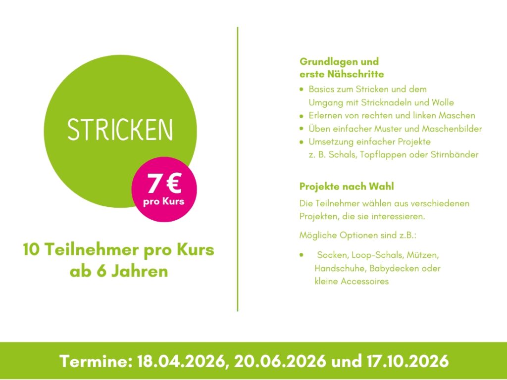 Ganz nach dem Motto „Die einen können es, die anderen möchten es lernen“ steht in unserem Strickkurs der gemeinsame Austausch im Mittelpunkt. Unter Anleitung kann hier jeder das Stricken erlernen, gemeinsam mit anderen kreativ werden oder einfach neue Techniken entdecken.